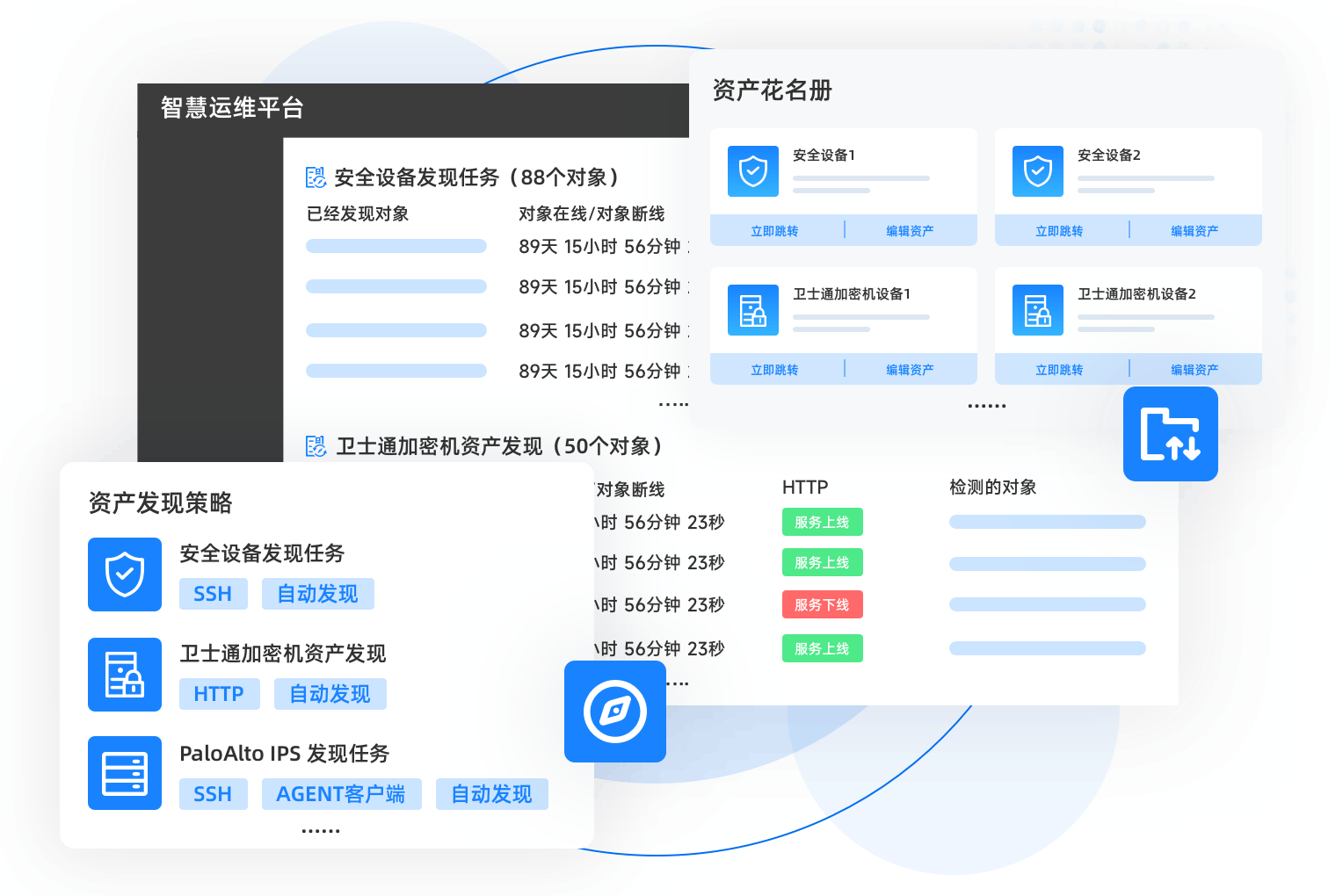 自动发现各种安全相关设备系统,包括安全设备、以及关联的网络资源、操作系统等,并进行全面统一的管理。