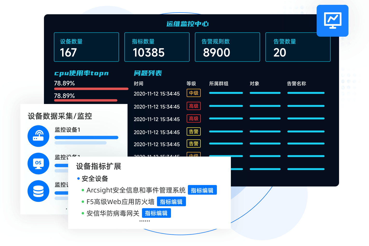 多种数据采集手段和监控方式,保障设备指标监控的实时性和准确性,支持指标DevOps构建