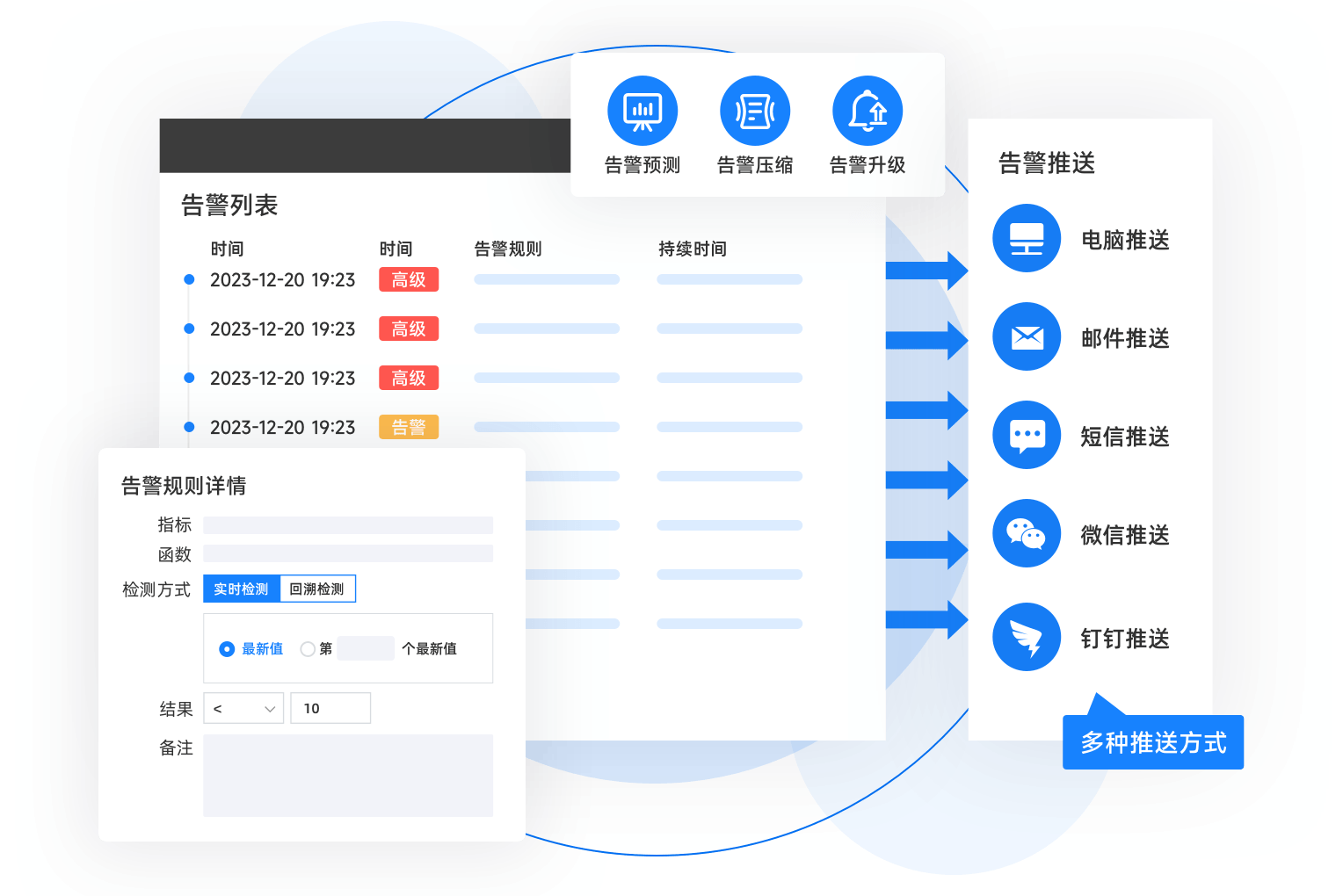 灵活的告警规则设立,支持数据预测告警以及SLA升级。多告警通道输出,保证告警及时送达