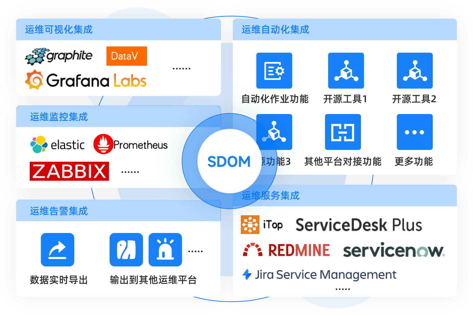 开放式架构,支持和运维生态其他产品服务快速集成,更好地完善运维规范化管理以及有效落实运维的闭环流程